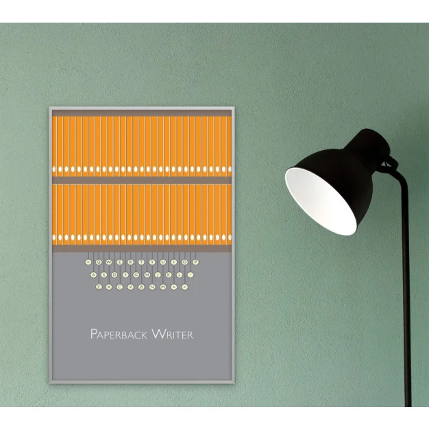 Esta pieza gráfica presenta líneas de lomos de Penguin Paperback abstraídos en estantes. El teclado se basa en una máquina de escribir antigua con teclas de color crema. El género está influenciado por artistas pop como Andy Warhol con sus imágenes repetidas.